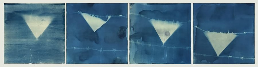 While at the Korean DMZ in the summer of 2025 I created some cyanotypes. I had never used the medium before, but because of the directness of the photographic process, it worked well with my conceptual approach. Indeed, each is a measure of time spent at the edge of a minefield. The unexposed paper was pushed onto the barbs of the barbed wire fencing until the exposure was complete. I have put them side-by-side in a set of four which creates its own fenceline.