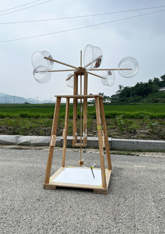 It occurred to me that the wind that flows freely across the border is shaped by the topography and may thereby carry traces of the land’s tragic history. Speculative to be sure, but the notion of divining the history of a place through something as fleeting and constant as the wind is compelling. What fellow artist David McDougall and I did was to deploy a number of wind-drawing machines in the border area of Cheorwon County that would channel that wind into drawings.